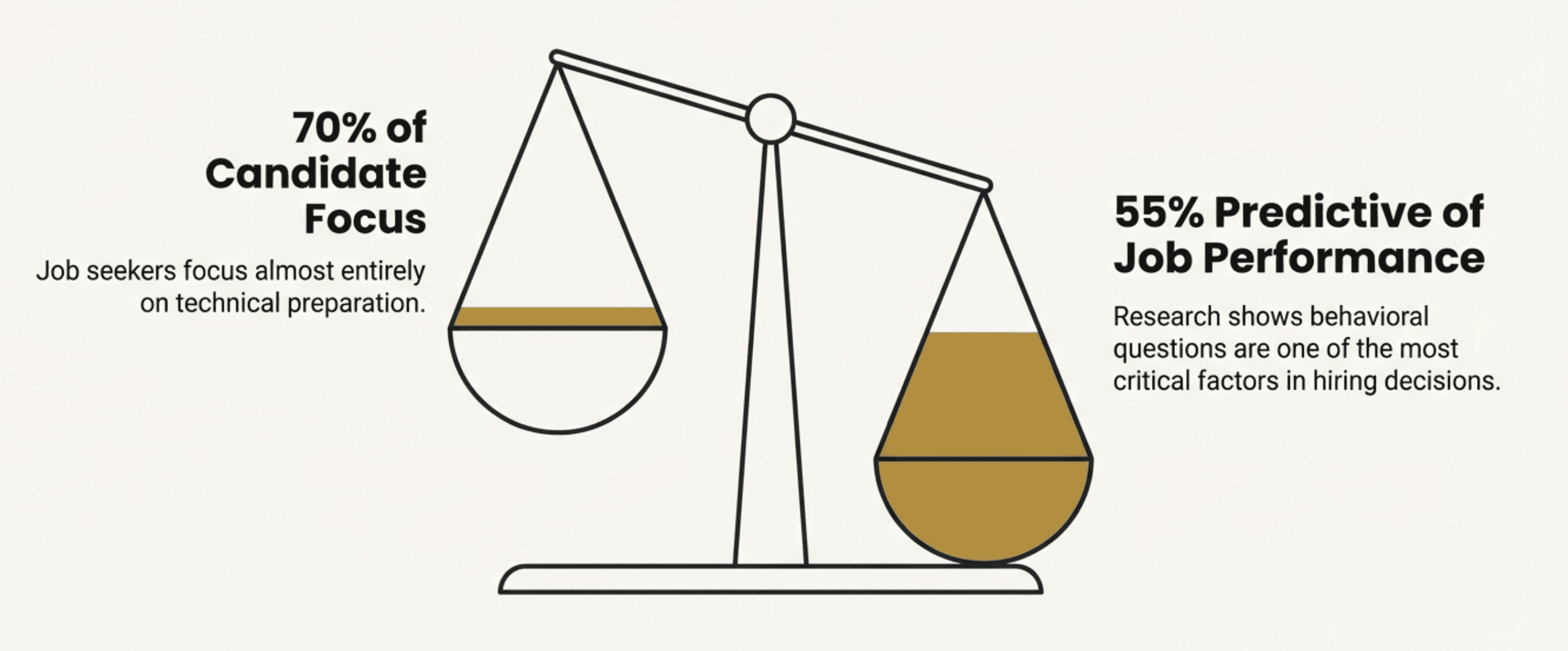 Here's the uncomfortable truth, 70% of job seekers focus almost entirely on technical preparation while treating behavioral interviews as "just talking about yourself." Yet research shows that behavioral questions are 55% predictive of future job performance, making them one of the most critical factors in hiring decisions.