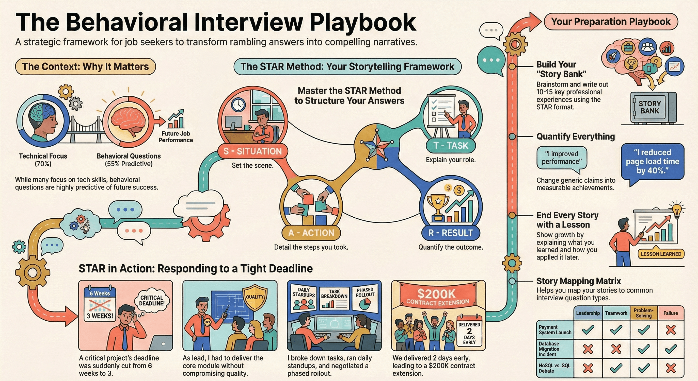 Master behavioral interviews with proven frameworks, 10 sample answers, and expert strategies. Learn the STAR method and build your story bank to land your dream job.